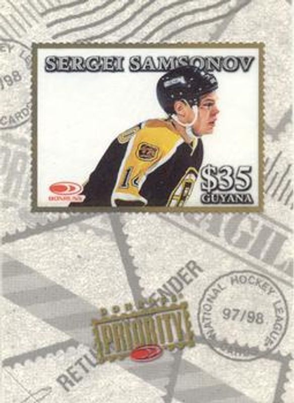 The Sergei Samsonov 1997 Donruss Priority Stamps Gold Rookie card is 1 of 14 Sergei Samsonov's card variations in the 1997 Donruss Priority set being tracked by Sports Card Investor, including #178 Base, #200 Base, #218 Base, #6 Direct Deposit Promos, and #218 Stamp of Approval /100.