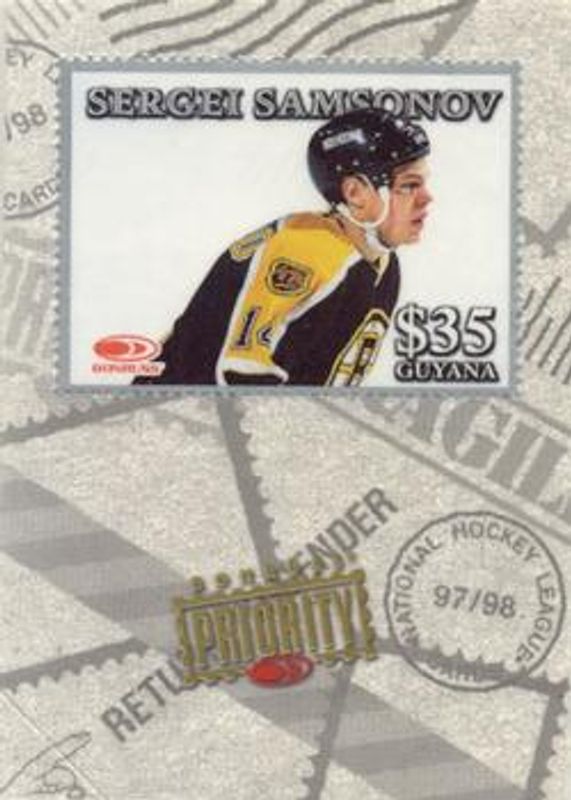 The Sergei Samsonov 1997 Donruss Priority Stamps Silver Rookie card is 1 of 14 Sergei Samsonov's card variations in the 1997 Donruss Priority set being tracked by Sports Card Investor, including #178 Base, #200 Base, #218 Base, #6 Direct Deposit Promos, and #218 Stamp of Approval /100.