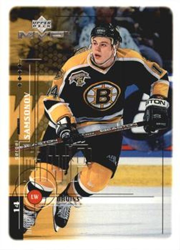 The Sergei Samsonov 1998 Upper Deck MVP #10 Base card is 1 of 8 Sergei Samsonov's card variations in the 1998 Upper Deck MVP set being tracked by Sports Card Investor, including Silver Script, Gold Script /100, Super Script /25, OT Heroes, and Snipers.
