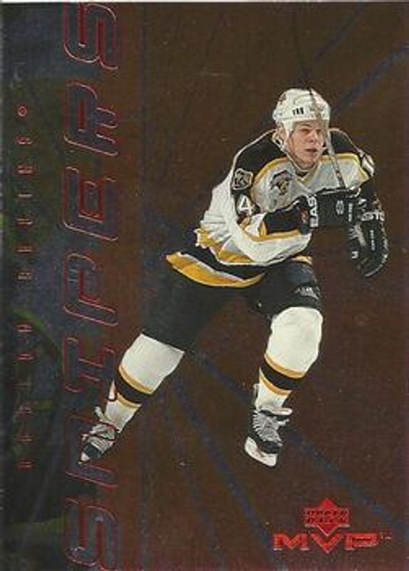 The Sergei Samsonov 1998 Upper Deck MVP #S03 Snipers card is 1 of 8 Sergei Samsonov's card variations in the 1998 Upper Deck MVP set being tracked by Sports Card Investor, including Base, Silver Script, Gold Script /100, Super Script /25, and OT Heroes.