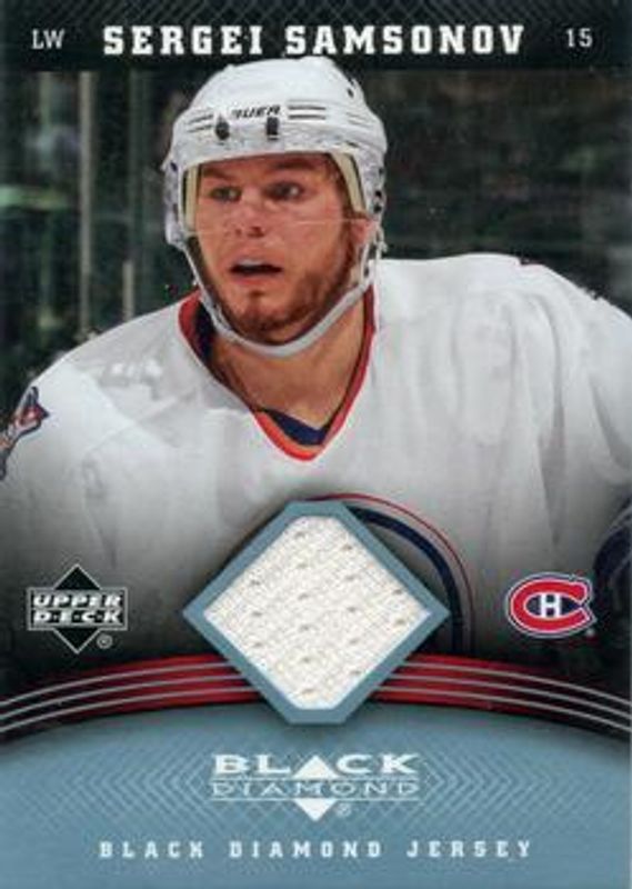 The Sergei Samsonov 2006 Upper Deck Black Diamond #J-SS Jerseys card is 1 of 9 Sergei Samsonov's card variations in the 2006 Upper Deck Black Diamond set being tracked by Sports Card Investor, including Base, Ruby /100, Gold /10, Black /1, and Jerseys Ruby /100.