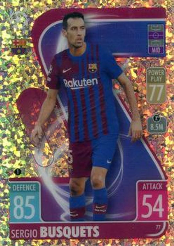 The Sergio Busquets 2021 Topps Chrome Match Attax UEFA Champions League & Europa League #77 Speckle card is 1 of 13 Sergio Busquets' card variations in the 2021 Topps Chrome Match Attax UEFA Champions League & Europa League set being tracked by Sports Card Investor, including Base, Refractor, Purple /299, Pink /199, and Aqua /150.