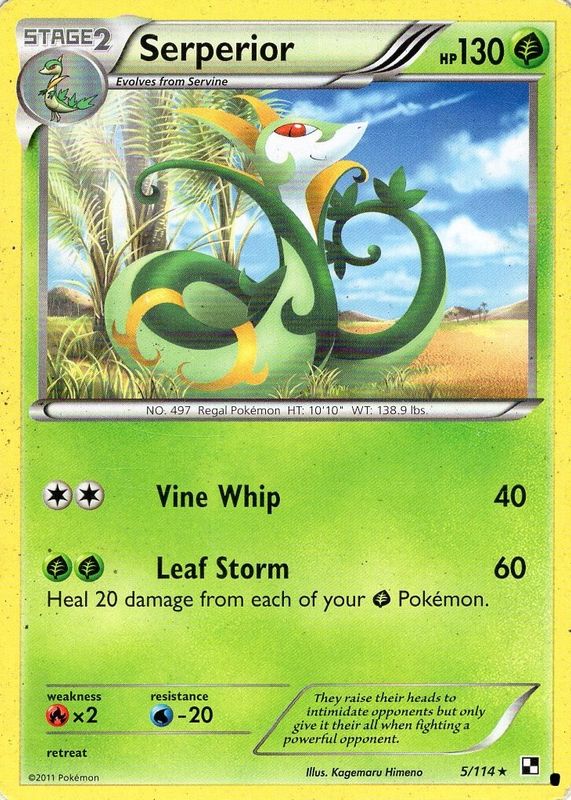 The Serperior 2011 Black & White #005/114 Promo (Green Tornado Theme Deck) card in Raw TCG (Near Mint) condition has not changed in price in the last 30 days and was last sold for $1.99 .