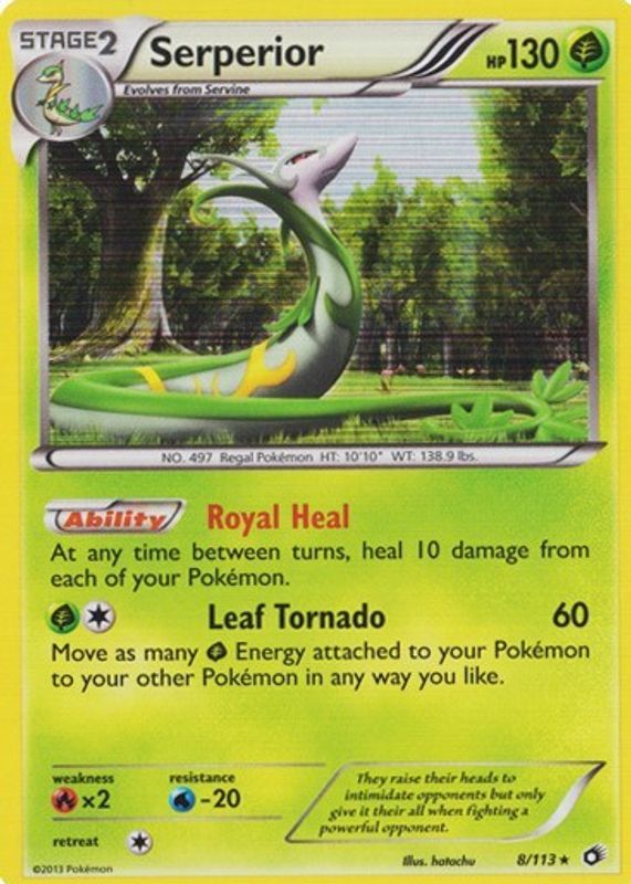 The Serperior 2013 Black & White: Legendary Treasures #008/113 Holo card in Raw TCG (Lightly Played) condition has moved up $1.27 (+113%) in the last 30 days and was last sold for $2.39 .