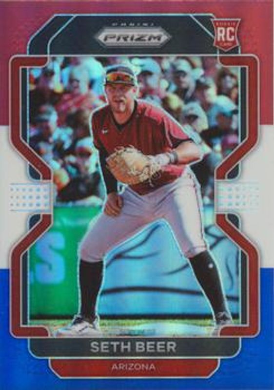 The Seth Beer 2022 Prizm #25 Red White Blue Rookie card is 1 of 69 Seth Beer's card variations in the 2022 Prizm set being tracked by Sports Card Investor, including Base, Blue, Blue Velocity, Carolina Blue, and Cosmic Haze.