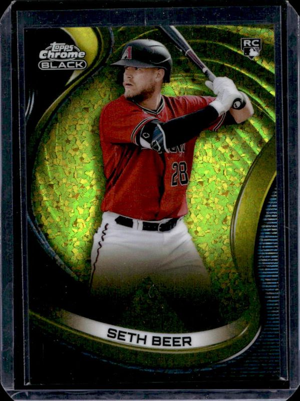 The Seth Beer 2022 Topps Chrome Black #39 Gold Mini Diamond Refractor /50 Rookie card is 1 of 20 Seth Beer's card variations in the 2022 Topps Chrome Black set being tracked by Sports Card Investor, including Base, Refractor /199, Purple Mini Diamond Refractor /150, Green Atomic Refractor /99, and Green Refractor /99.