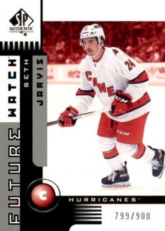 The Seth Jarvis 2021 SP Authentic #01FW-SJ 2001 Retro Future Watch /900 Rookie card is 1 of 18 Seth Jarvis' card variations in the 2021 SP Authentic set being tracked by Sports Card Investor, including Black Autographs, Limited Red, Limited Gold /99, Limited Black /1, and Future Watch Acetate.