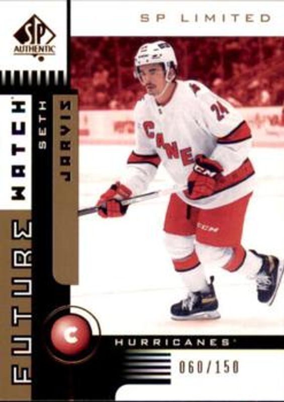 The Seth Jarvis 2021 SP Authentic #01FW-SJ 2001 Retro Future Watch Limited /150 Rookie card is 1 of 18 Seth Jarvis' card variations in the 2021 SP Authentic set being tracked by Sports Card Investor, including Black Autographs, Limited Red, Limited Gold /99, Limited Black /1, and Future Watch Acetate.