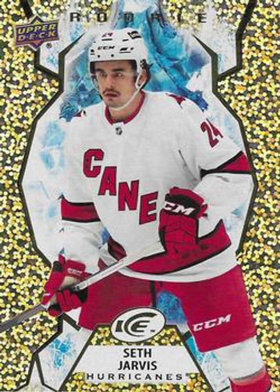 The Seth Jarvis 2021 Upper Deck Ice #150 Gold /25 Rookie card is 1 of 28 Seth Jarvis' card variations in the 2021 Upper Deck Ice set being tracked by Sports Card Investor, including #150 Base /999, #234 Base /999, #150 Ice Blue, #150 Jersey, and #150 Lavender.