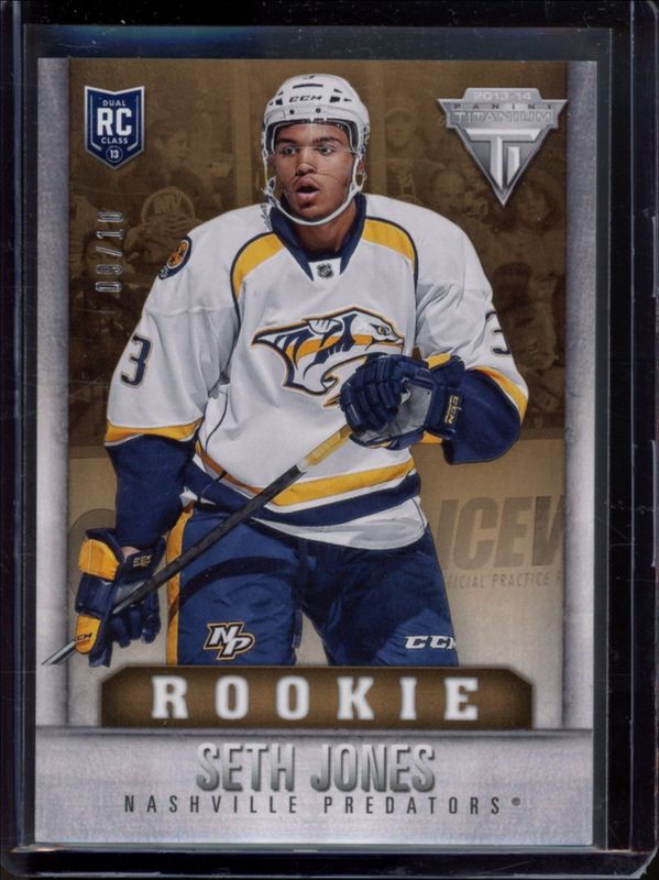 The Seth Jones 2013 Titanium #236 Commons Retail Gold /10 Rookie card is 1 of 16 Seth Jones' card variations in the 2013 Titanium set being tracked by Sports Card Investor, including Base /91, Commons Retail /299, Commons Retail Red /99, Hobby Draft Position /20, and Printing Plates Black /1.