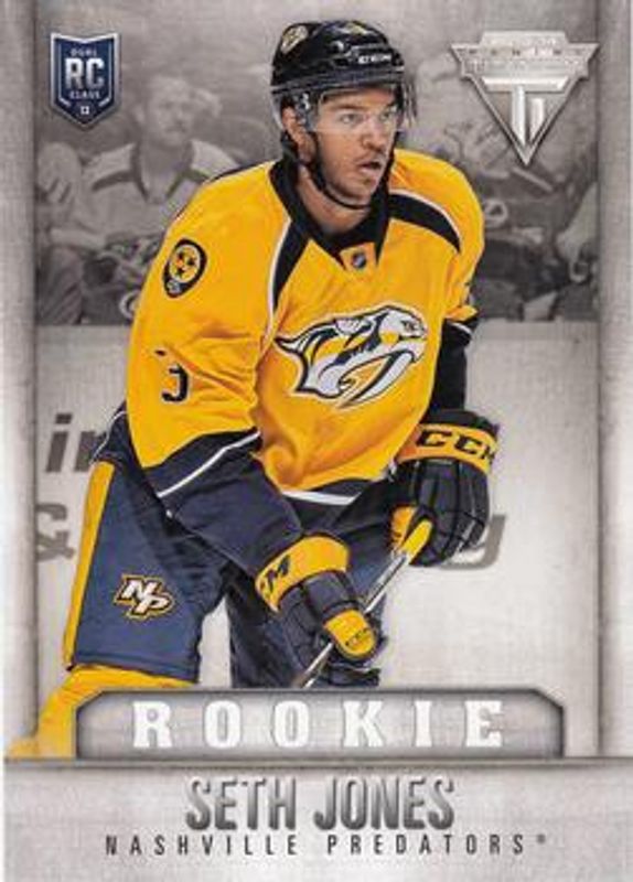 The Seth Jones 2013 Titanium #J-2 Rookies Jumbo card is 1 of 16 Seth Jones' card variations in the 2013 Titanium set being tracked by Sports Card Investor, including Base /91, Commons Retail /299, Commons Retail Red /99, Hobby Draft Position /20, and Commons Retail Gold /10.
