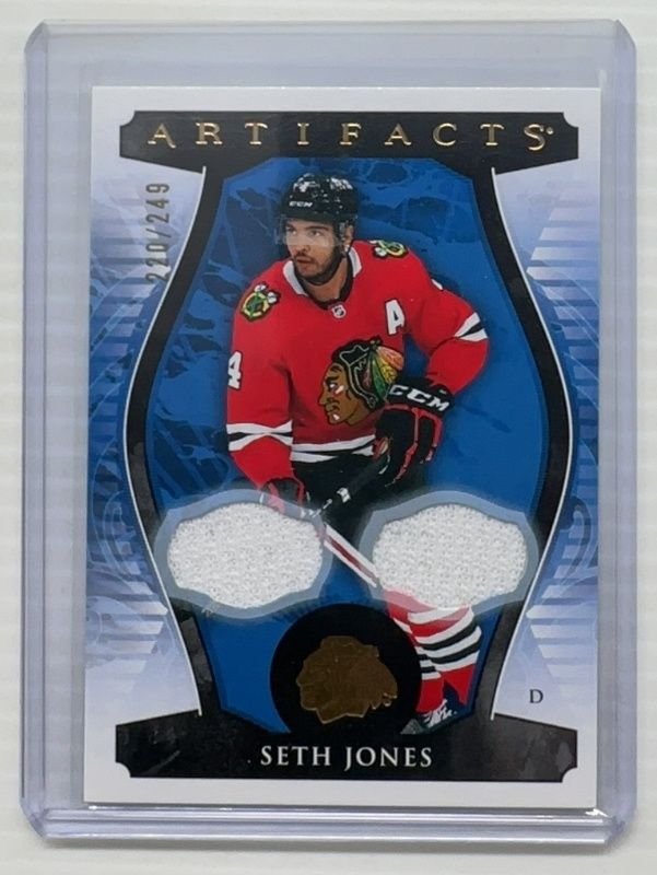 The Seth Jones 2023 Upper Deck Artifacts #21 Material - Gold /199 card is 1 of 20 Seth Jones' card variations in the 2023 Upper Deck Artifacts set being tracked by Sports Card Investor, including Base /999, Turquoise, Ruby /499, Copper /299, and Royal Blue /199.