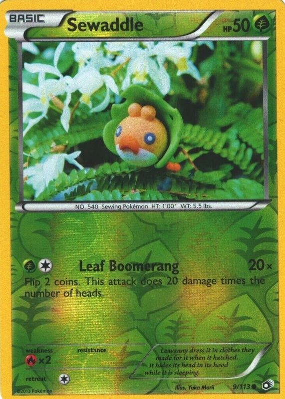 The Sewaddle 2013 Black & White: Legendary Treasures #009/113 Reverse Holo card in Raw TCG (Near Mint) condition has moved down -$10.25 (-73.3%) in the last 30 days and was last sold for $3.74 .