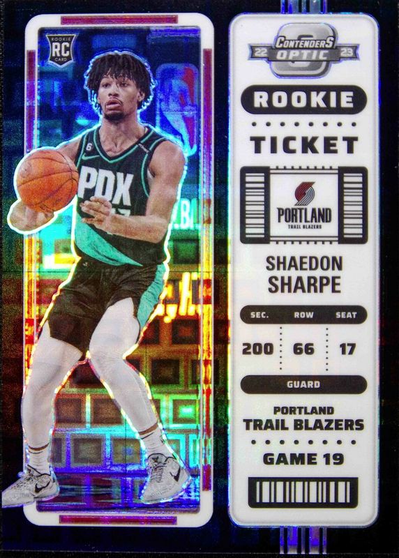 The Shaedon Sharpe 2022 Contenders Optic #17 Black Pandora /(SSP) Rookie card in Raw condition has not changed in price in the last 30 days and was last sold for $61.60 .