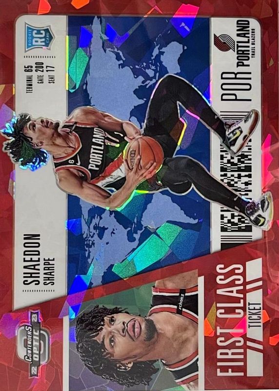 The Shaedon Sharpe 2022 Contenders Optic #18 First Class Ticket - Blue Cracked Ice /75 Rookie card in Raw condition has not changed in price in the last 30 days and was last sold for $21.43 .