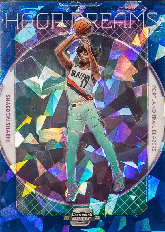 The Shaedon Sharpe 2022 Contenders Optic #21 Hoop Dreams - Blue Cracked Ice /75 Rookie card in Raw condition has not changed in price in the last 30 days and was last sold for $10.68 .