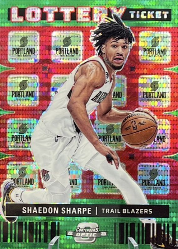 The Shaedon Sharpe 2022 Contenders Optic #7 Lottery Ticket - Green Pulsar /25 Rookie card in Raw condition has not changed in price in the last 30 days and was last sold for $5.50 .