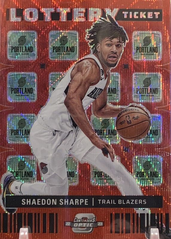 The Shaedon Sharpe 2022 Contenders Optic #7 Lottery Ticket - Red Wave Rookie card in Raw condition has not changed in price in the last 30 days and was last sold for $2.32 .