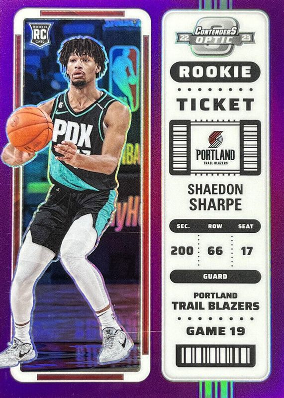 2022-23 Panini Contenders Optic Shaedon Sharpe Purple RC Rookie Ticket SSP 14/15