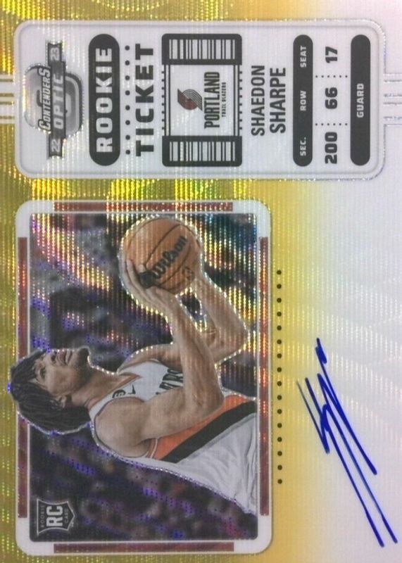 The Shaedon Sharpe 2022 Contenders Optic #133 Rookie Ticket Auto - Gold Wave /10 card in Raw condition has not changed in price in the last 30 days and was last sold for $600.00 .