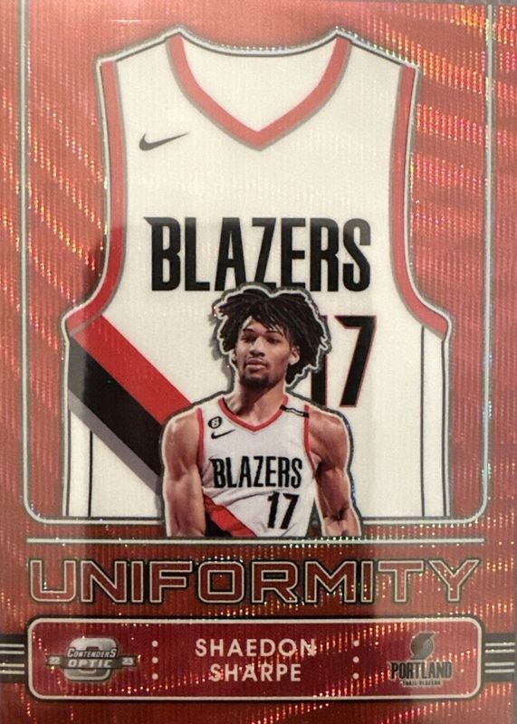 The Shaedon Sharpe 2022 Contenders Optic #29 Uniformity - Red Wave Rookie card in Raw condition has not changed in price in the last 30 days and was last sold for $19.00 .