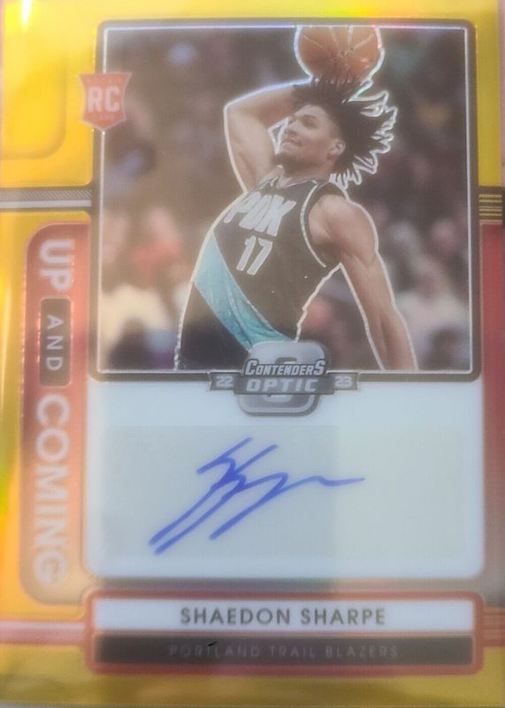 The Shaedon Sharpe 2022 Contenders Optic #UCA-SHS Up and Coming Autographs - Gold /10 Rookie card in Raw condition has not changed in price in the last 30 days and was last sold for $180.50 .