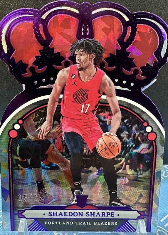 The Shaedon Sharpe 2022 Crown Royale #48 Purple Crystal /25 Rookie card in Raw condition has not changed in price in the last 30 days and was last sold for $25.00 .