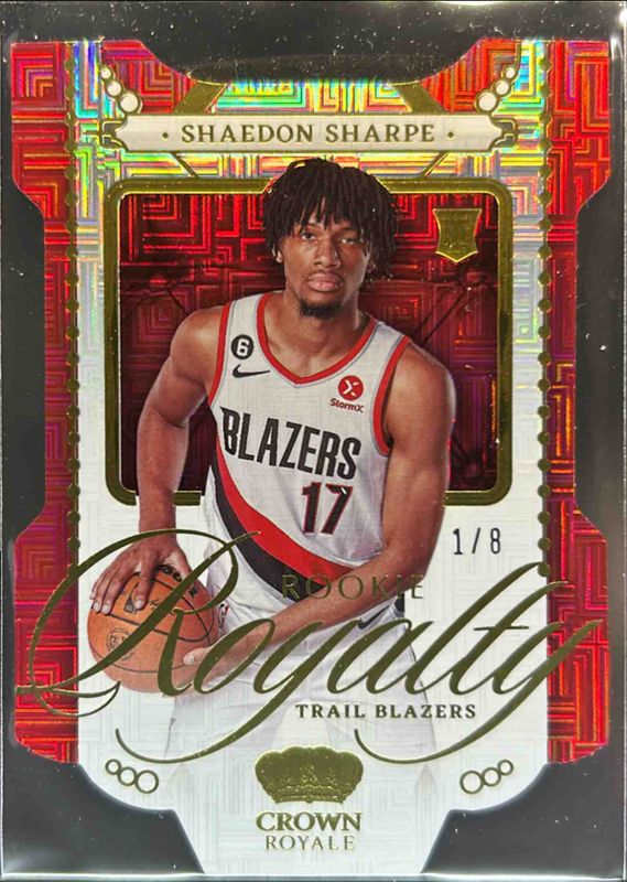 The Shaedon Sharpe 2022 Crown Royale #7 Rookie Royalty - Asia Gold /8 card is 1 of 43 Shaedon Sharpe's card variations in the 2022 Crown Royale set being tracked by Sports Card Investor, including Base, Asia Red, Crystal, Blue Crystal /99, and Pink Crystal /75.