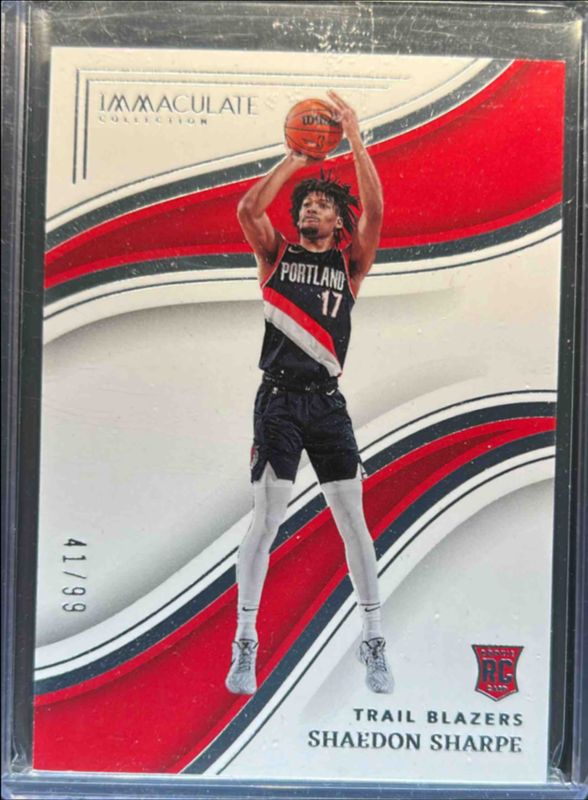 The Shaedon Sharpe 2022 Immaculate #72 Base /99 Rookie card is 1 of 36 Shaedon Sharpe's card variations in the 2022 Immaculate set being tracked by Sports Card Investor, including #112 Base /99, #112 Red /49, #72 Red /49, #72 Blue /25, and #112 Gold /10.