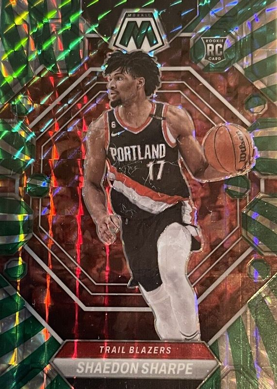 The Shaedon Sharpe 2022 Mosaic #213 FOTL Green Swirl /5 Rookie card in Raw condition has not changed in price in the last 30 days and was last sold for $222.50 .