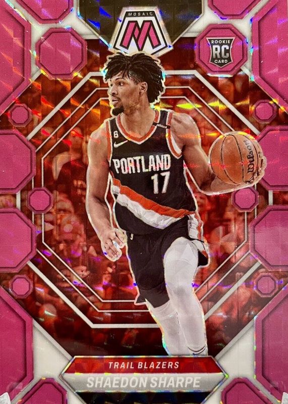 The Shaedon Sharpe 2022 Mosaic #213 Pink Fluorescent /10 Rookie card in Raw condition has not changed in price in the last 30 days and was last sold for $125.00 .