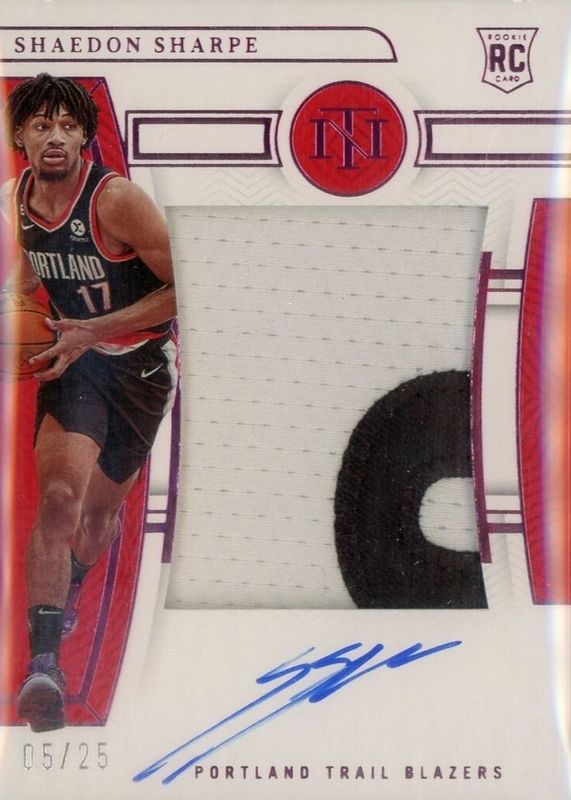 This card is 1 of 10 Shaedon Sharpe's card variations in the 2022 National Treasures set being tracked by Sports Card Investor, including Rookie Patch Auto /99, Rookie Patch Auto - Red /75, Rookie Patch Auto - Bronze /49, Rookie Patch Auto - Gold FOTL /24, and Rookie Patch Auto - Gold /10.