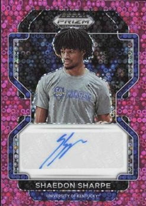 The Shaedon Sharpe 2022 Prizm Draft Picks #DP-SHA Draft Picks Autographs - Pink Circles /20 Rookie card is 1 of 139 Shaedon Sharpe's card variations in the 2022 Prizm Draft Picks set being tracked by Sports Card Investor, including #54 Base, #54b Base, #54 Blue Circles, #54b Choice Blue Yellow & Green, and #54 Choice Blue Yellow & Green.