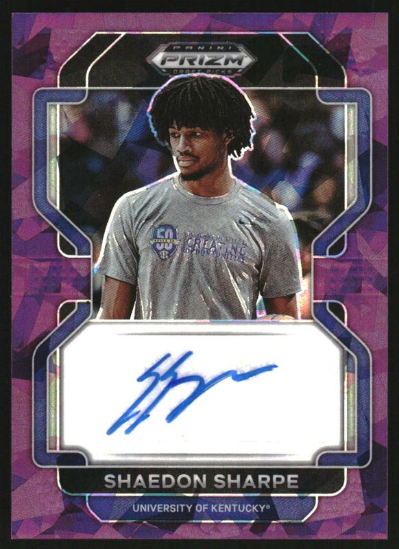 The Shaedon Sharpe 2022 Prizm Draft Picks #DP-SHA Draft Picks Autographs - Purple Ice /99 Rookie card is 1 of 139 Shaedon Sharpe's card variations in the 2022 Prizm Draft Picks set being tracked by Sports Card Investor, including #54 Base, #54b Base, #54 Blue Circles, #54b Choice Blue Yellow & Green, and #54 Choice Blue Yellow & Green.