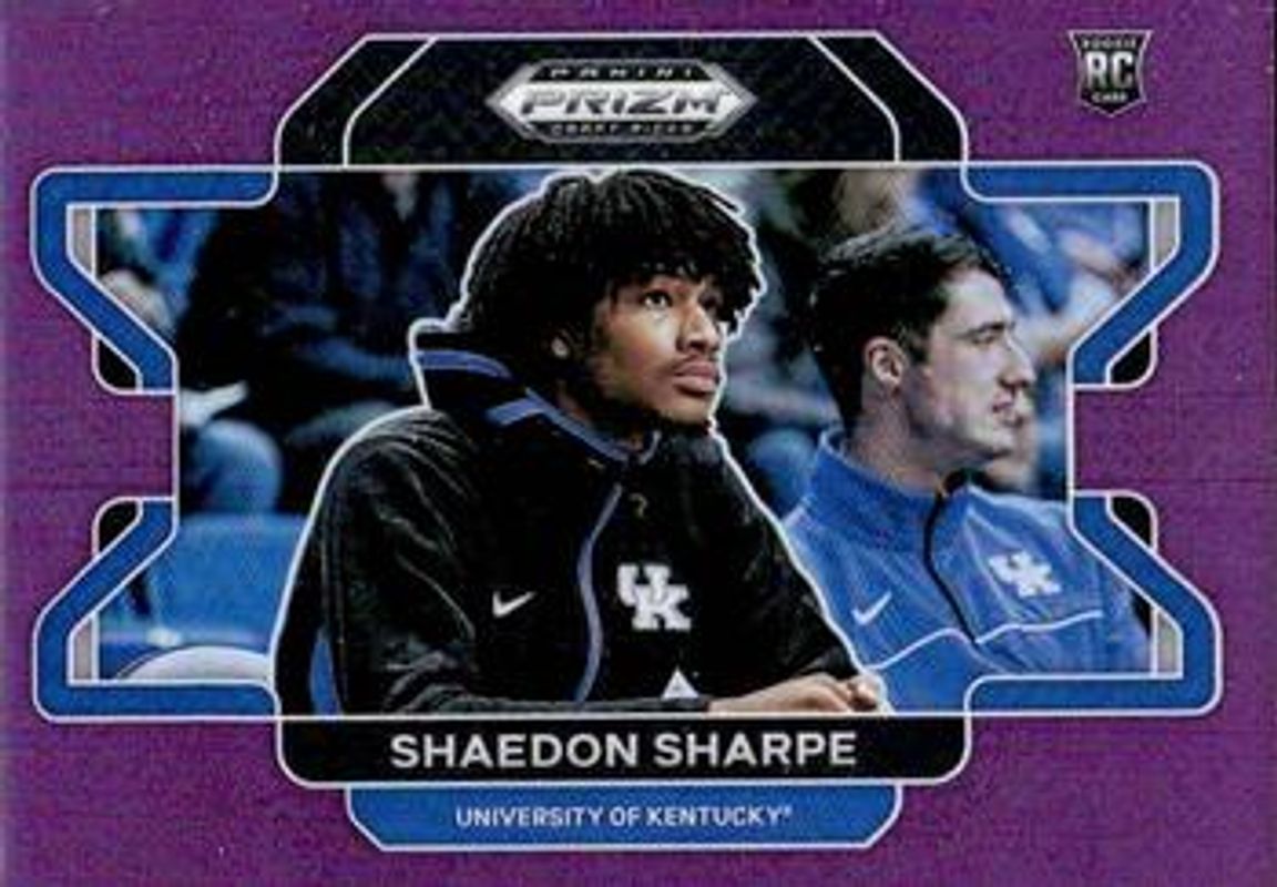 The Shaedon Sharpe 2022 Prizm Draft Picks #54b Purple /75 Rookie card is 1 of 139 Shaedon Sharpe's card variations in the 2022 Prizm Draft Picks set being tracked by Sports Card Investor, including #54 Base, #54b Base, #54 Blue Circles, #54b Choice Blue Yellow & Green, and #54 Choice Blue Yellow & Green.