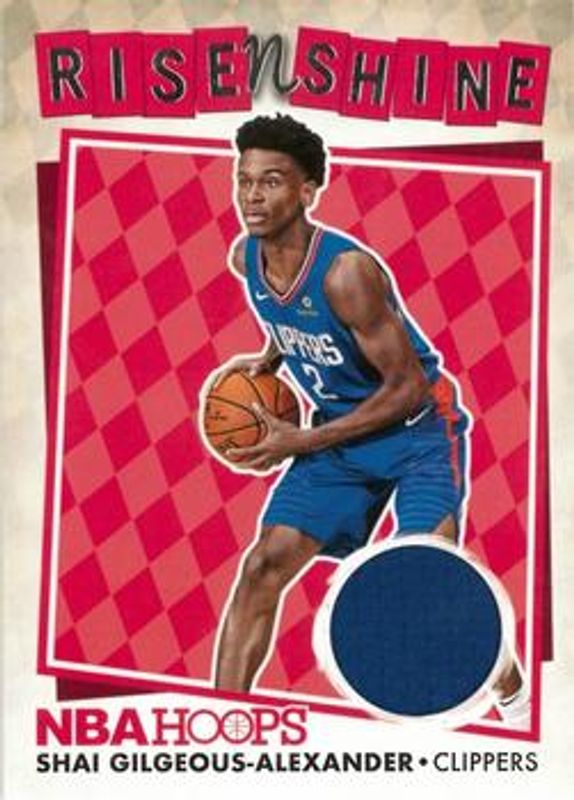 The Shai Gilgeous-Alexander 2018 Hoops #RNS-SGA Rise N Shine Memorabilia Rookie card is 1 of 33 Shai Gilgeous-Alexander's card variations in the 2018 Hoops set being tracked by Sports Card Investor, including Base, Red Backs, Premium Boxed Set /199, Blue, and Class of 2018.