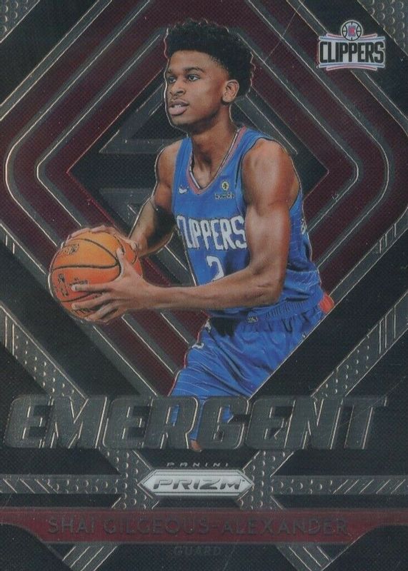 The Shai Gilgeous-Alexander 2018 Prizm #11 Emergent Rookie card in Raw condition has moved up $4.87 (+118%) in the last 30 days and was last sold for $8.99 .
