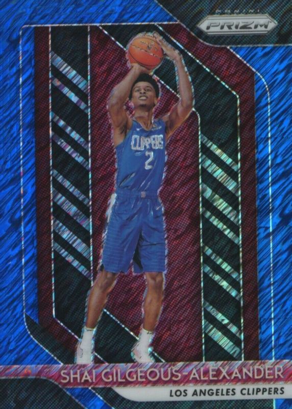 The Shai Gilgeous-Alexander 2018 Prizm #184 FOTL Blue Shimmer /7 Rookie card in Raw condition has not changed in price in the last 30 days and was last sold for $2,376.01 .