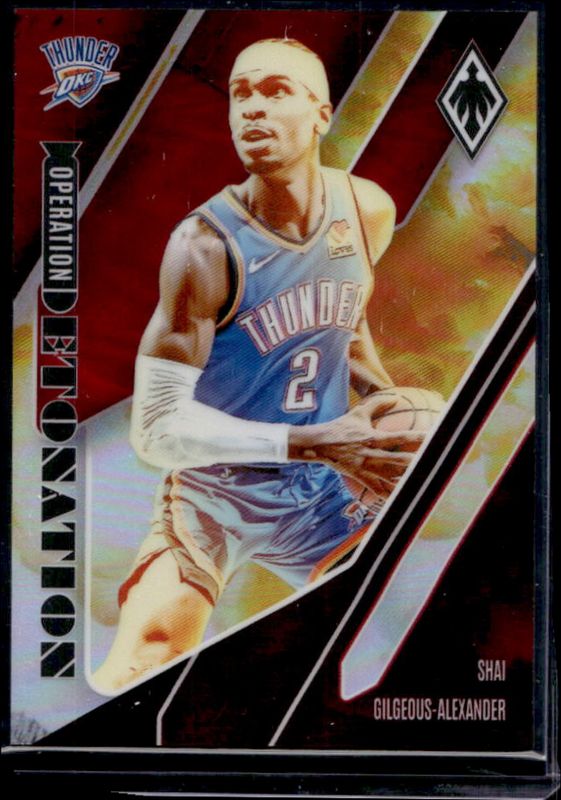 The Shai Gilgeous-Alexander 2023 Phoenix #3 Operation Detonation - Red /125 card is 1 of 209 Shai Gilgeous-Alexander's card variations in the 2023 Phoenix set being tracked by Sports Card Investor, including Base, Blue Ice, Color Burst, Dream Weaver, and Hieroglyphs.