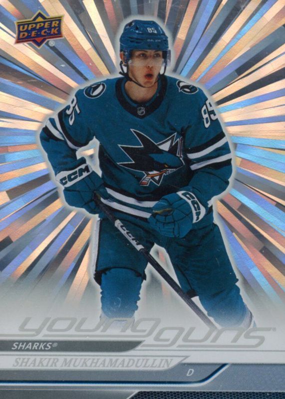 This card is 1 of 8 Shakir Mukhamadullin's card variations in the 2024 Upper Deck set being tracked by Sports Card Investor, including Young Guns Base, Young Guns - Clear Cut, Young Guns - Deluxe /250, Young Guns - UD Exclusives /100, and Young Guns - Outburst Red /25.