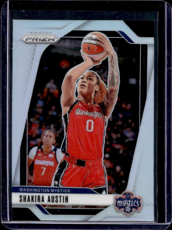The Shakira Austin 2024 Prizm WNBA #134 Silver Rookie card is 1 of 43 Shakira Austin's card variations in the 2024 Prizm WNBA set being tracked by Sports Card Investor, including Base, Blue Velocity, Checkerboard, Green, and Ice.
