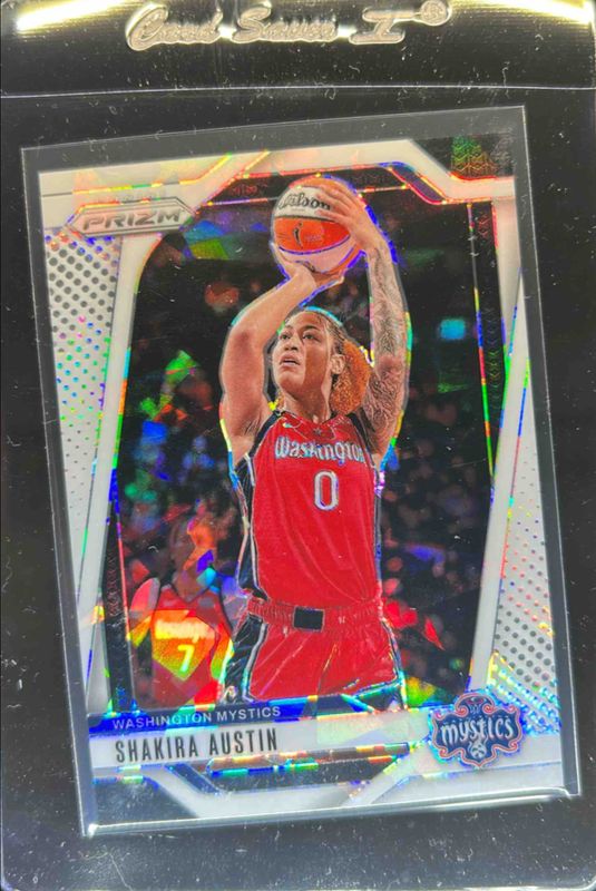 The Shakira Austin 2024 Prizm WNBA #134 White Ice /35 Rookie card is 1 of 43 Shakira Austin's card variations in the 2024 Prizm WNBA set being tracked by Sports Card Investor, including Base, Blue Velocity, Checkerboard, Green, and Ice.