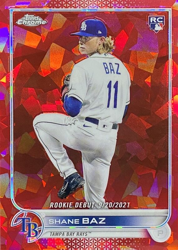 This card is 1 of 8 Shane Baz's card variations in the 2022 Topps Chrome Update Sapphire Edition set being tracked by Sports Card Investor, including Rookie Debut, Rookie Debut - Green /75, Rookie Debut - Gold /50, Rookie Debut - Orange /25, and Rookie Debut - Purple /10.