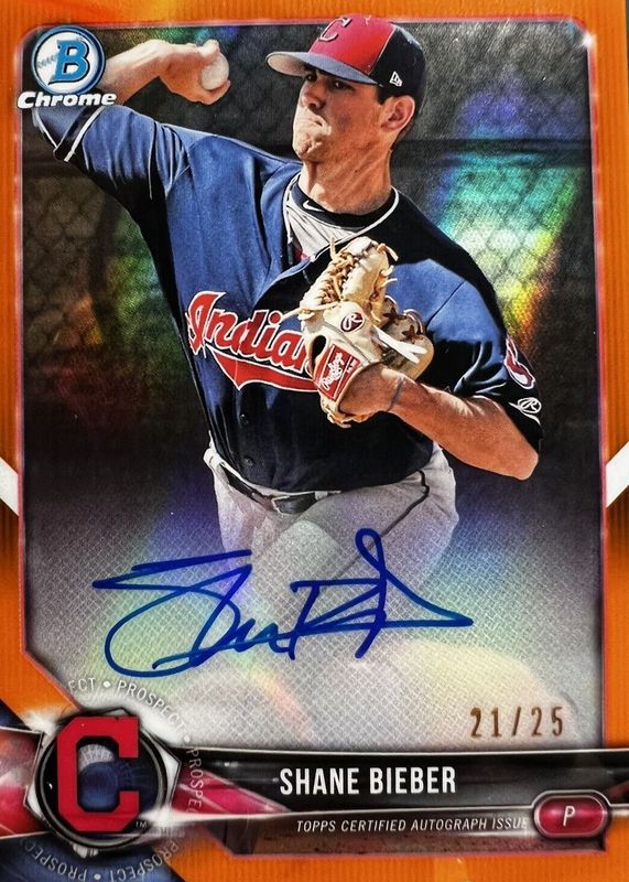 Best Prices Available For Sale of Shane Bieber 2018 Bowman Chrome #BCPA-SB Prospect Auto - Orange Refractor /25