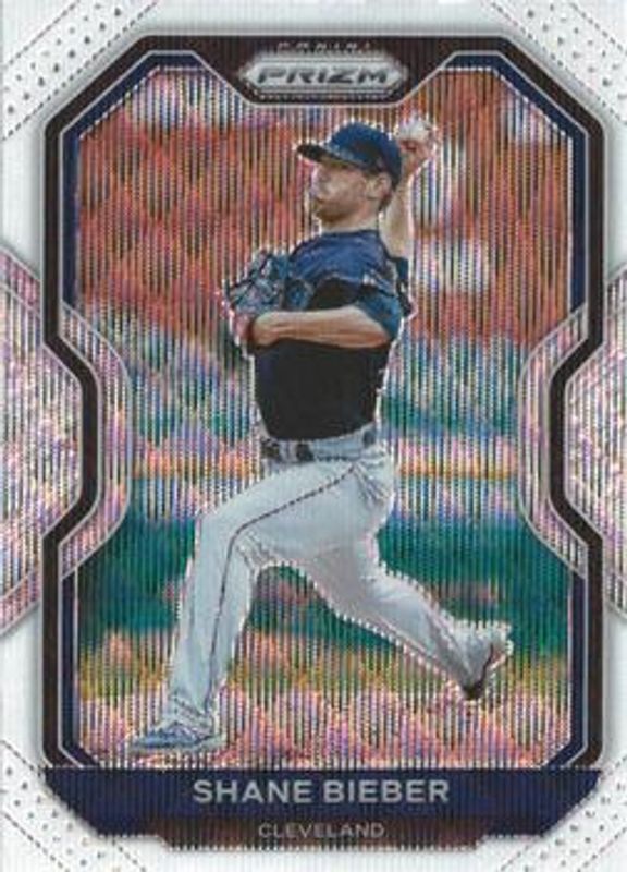 The Shane Bieber 2021 Prizm #166 White Wave card is 1 of 48 Shane Bieber's card variations in the 2021 Prizm set being tracked by Sports Card Investor, including Base, Blue, Blue Velocity, Carolina Blue, and Cosmic Haze.