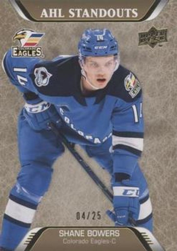 The Shane Bowers 2020 Upper Deck AHL #235 Gold /25 Rookie card is 1 of 13 Shane Bowers' card variations in the 2020 Upper Deck AHL set being tracked by Sports Card Investor, including #145 Base, #235 Base, #235 Red, #145 UD Exclusives /100, and #145 UD High Gloss /10.