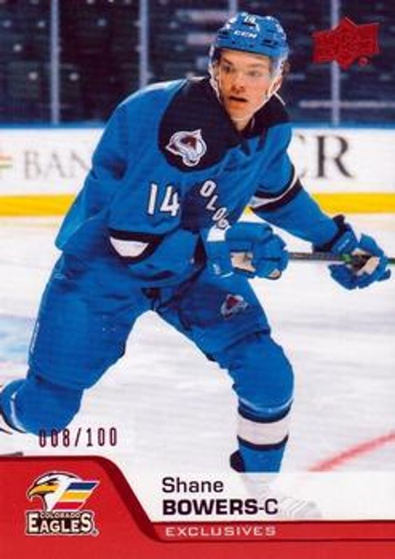 The Shane Bowers 2020 Upper Deck AHL #145 UD Exclusives /100 Rookie card is 1 of 13 Shane Bowers' card variations in the 2020 Upper Deck AHL set being tracked by Sports Card Investor, including #145 Base, #235 Base, #235 Red, #235 Gold /25, and #145 UD High Gloss /10.