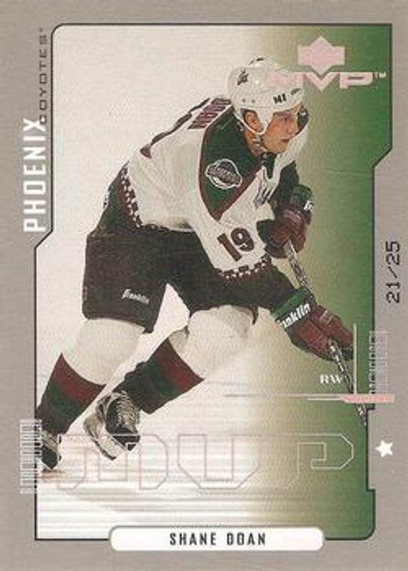 The Shane Doan 2000 Upper Deck MVP #138 First Star /25 card is 1 of 4 Shane Doan's card variations in the 2000 Upper Deck MVP set being tracked by Sports Card Investor, including Base, Third Star, and Second Star /100.
