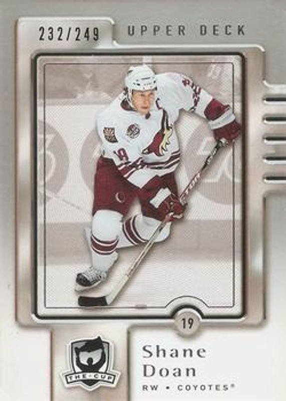 The Shane Doan 2006 Upper Deck The Cup #72 Base /249 card is 1 of 9 Shane Doan's card variations in the 2006 Upper Deck The Cup set being tracked by Sports Card Investor, including Gold /25, Black Rainbow /1, Printing Plates Black /1, Printing Plates Cyan /1, and Printing Plates Magenta /1.