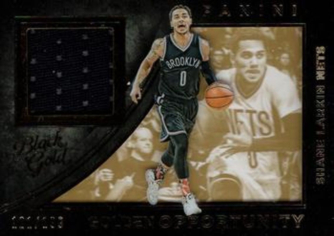 The Shane Larkin 2015 Black Gold #44 Golden Opportunity Memorabilia /199 card is 1 of 2 Shane Larkin's card variations in the 2015 Black Gold set being tracked by Sports Card Investor, including Golden Opportunity Memorabilia - Prime /25.